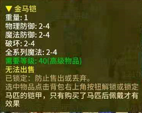 作为当前版本最强的马铠,既有帅气的颜值,属性加成也非常BT,穿戴金马铠有种”马配好鞍闯玛法“的豪迈感!